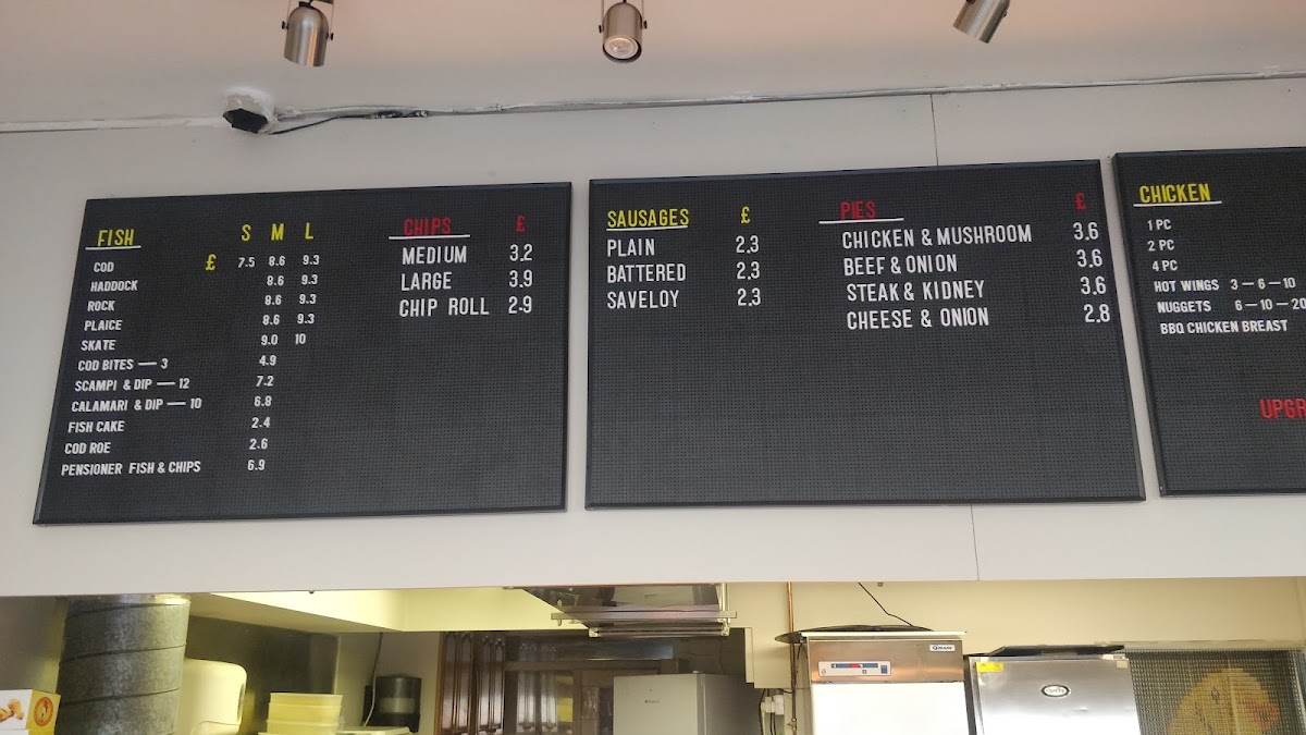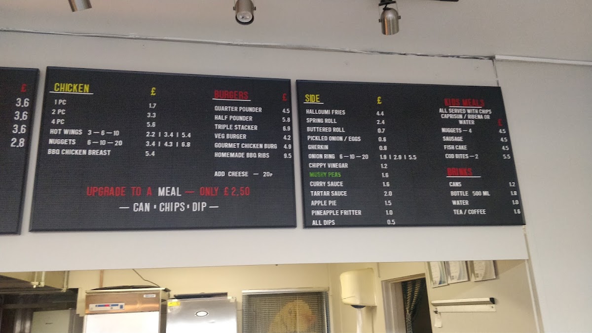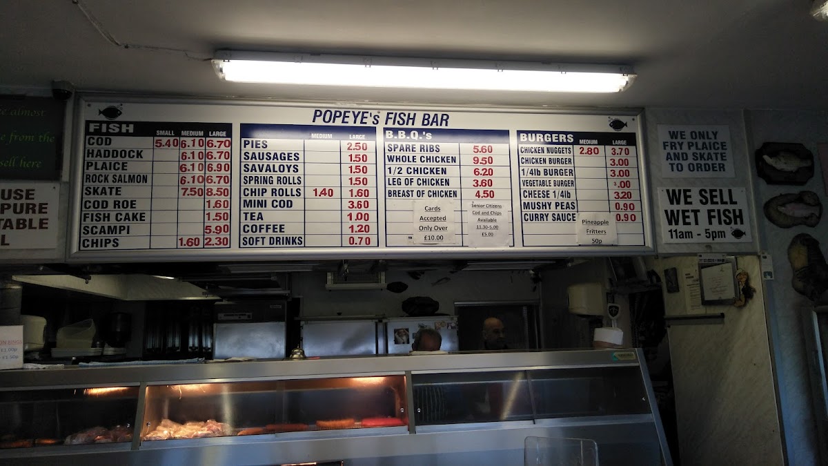 From a reviewer’s perspective, the menu at Popeyes Fish And Chips offers a solid and satisfying selection that covers both classic chip shop favourites and quick comfort food options. The burger range, including the Quarter Pounder, Half Pounder, Triple Stacker Veg Burger, and Gourmet Chicken Burg, provides hearty choices for those wanting something filling beyond fish. The sides such as Halloumi Fries, Spring Roll, Buttered Roll, Pickled Onion/Eggs, and Gherkin complement the mains well and add variety to the overall meal. For families, the kids’ options like Sausage, Fish Cake, and Cod Bites make the menu accessible for younger diners. The traditional fish selection is a highlight, with favourites like Cod, Haddock, Plaice, Rock Salmon, and Skate, offering the classic fish and chips experience the shop is known for. Additional items such as Hot Wings, Nuggets, Bbq Chicken Breast, along with drinks like Water and Tea, round out the menu nicely. Overall, the menu is varied, reasonably traditional, and well-suited for both quick takeaways and satisfying, classic fish and chip meals.